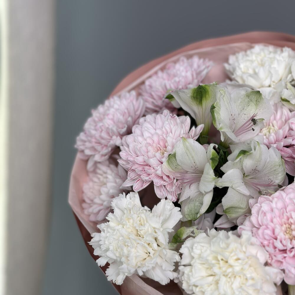 В букете представлены нежная хризантема в розовом цвете, которая идеально дополняется нежными альстромериями в белом цвете 😍 Каждый цветок был осмотрен и отобран с большой тщательностью, чтобы гарантировать максимальное качество и долговечность🥰